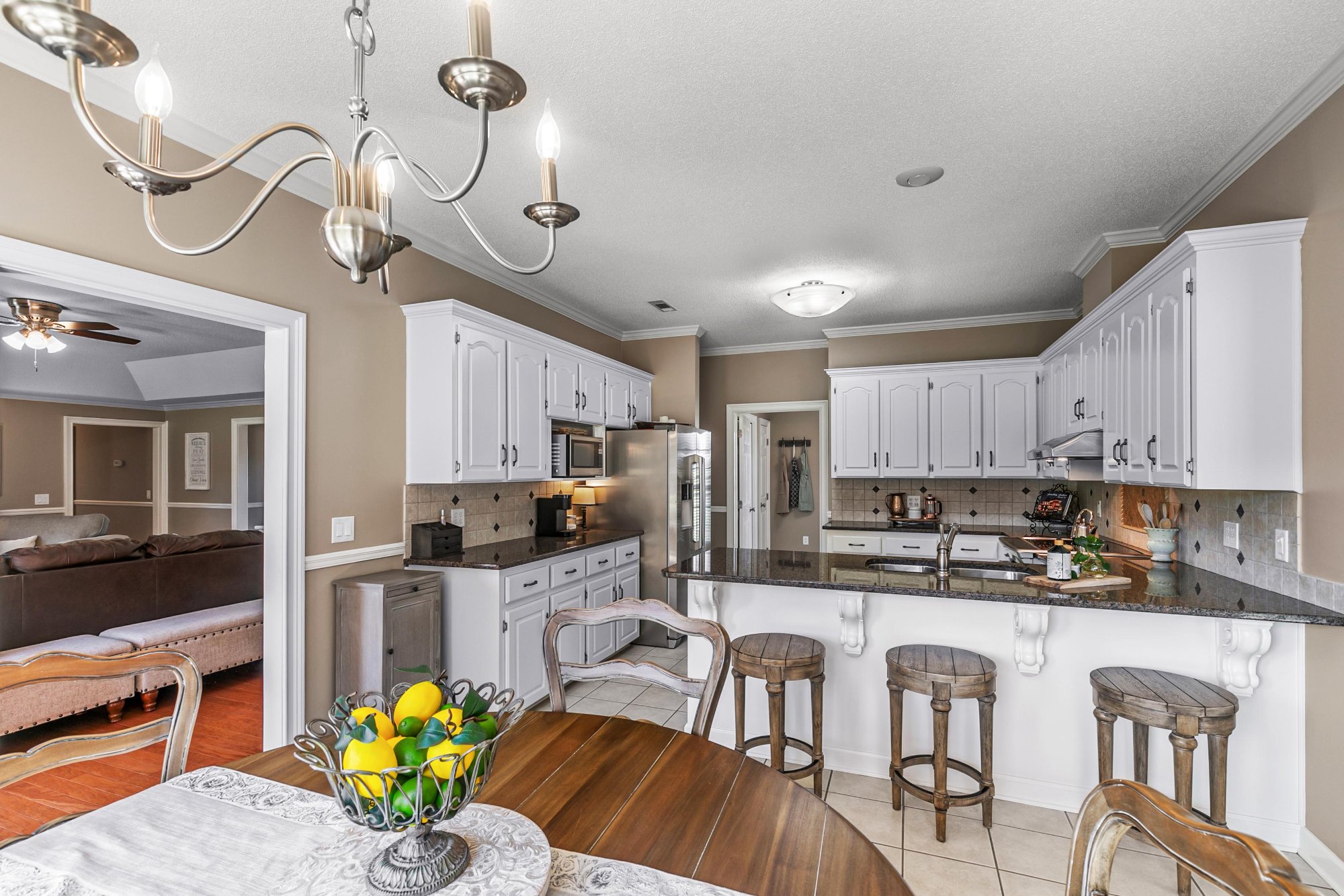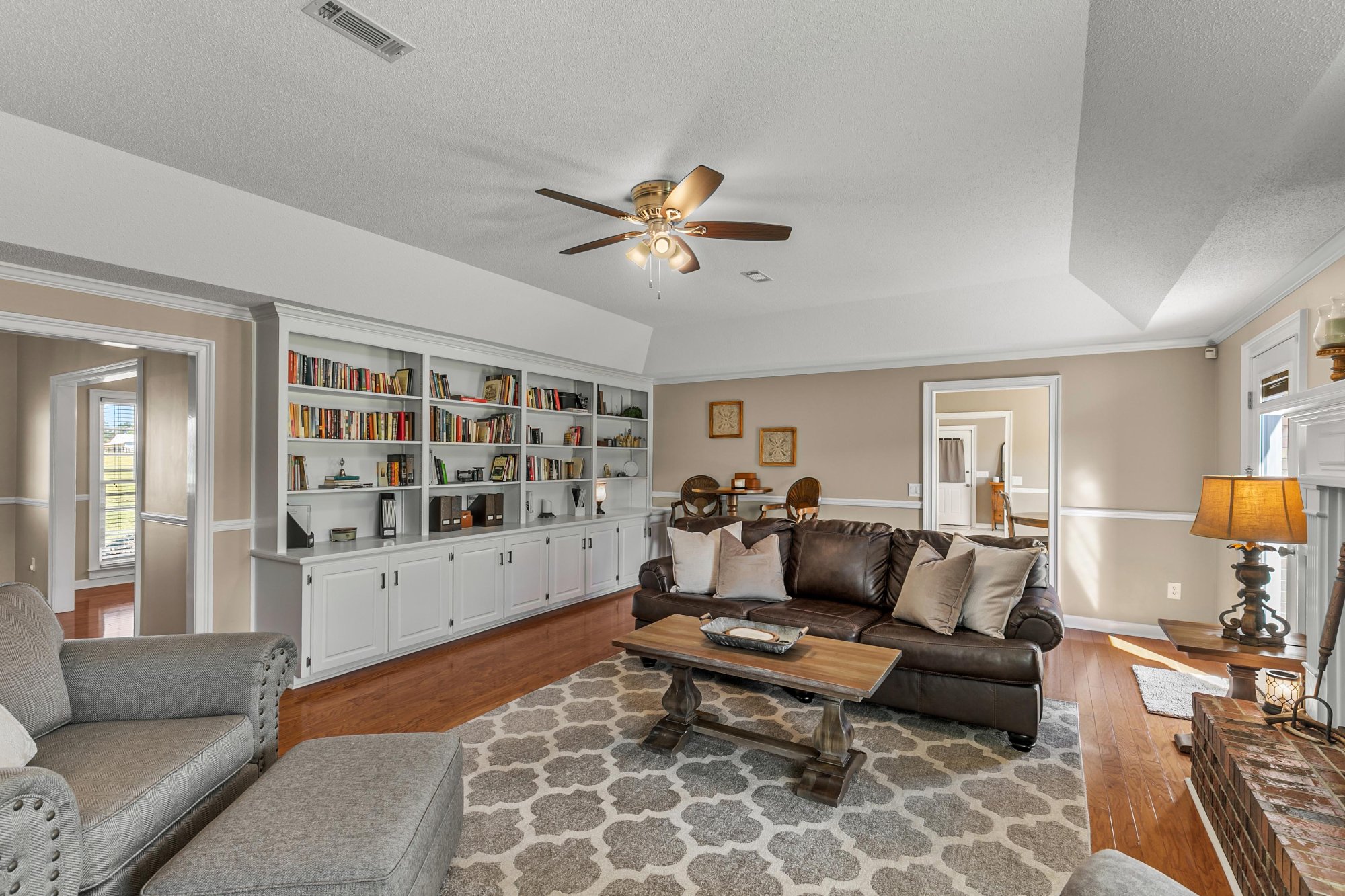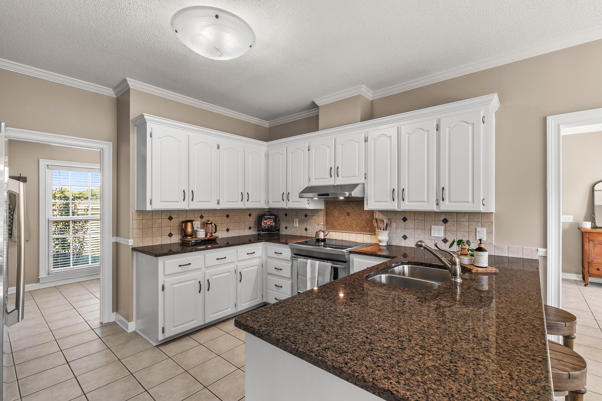 The kitchen fills with golden morning light. The fireplace anchors the living room on cool evenings. The sunroom overlooks the property and becomes your favorite room within the first week.