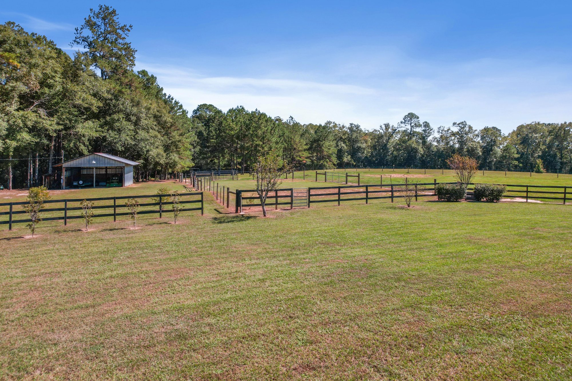 Gated, on paved road, with the rare blend of open pasture and mature hardwoods wrapping the borders for privacy. Plenty of room for animals and room for quiet.